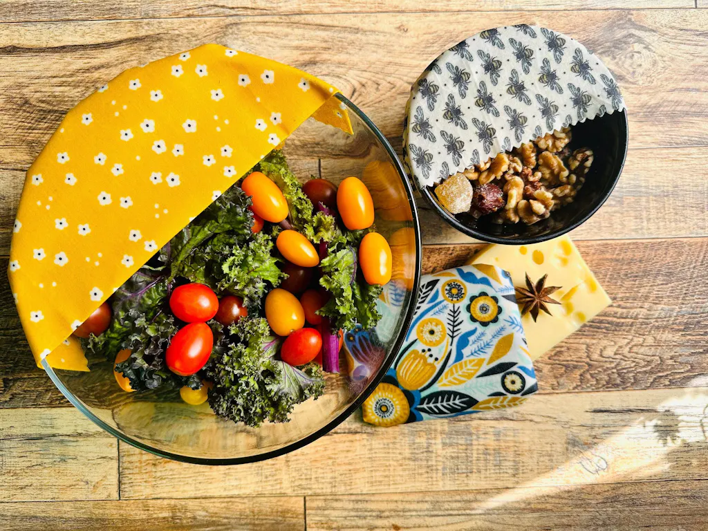 Beeswax food wraps are wonderful and eco friendly solution in reducing food and plastic waste.  Antibacterial properties of the ingredients and breathability keeps food fresh longer.  No need for single use plastic wrap, use beeswax wraps to cover plates, jars, bowls and wrap your cheese, bread and of course, veggies.